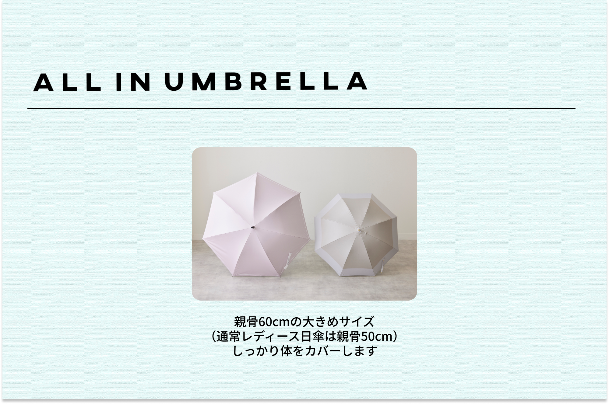 通常の日傘より大きい親骨60cmサイズにシックなデザインなので、男女問わず使えるユニセックス仕様。開くと直径約100cmの大きめサイズで、激しい雨も夏の強い日差しもしっかりカバーできます。