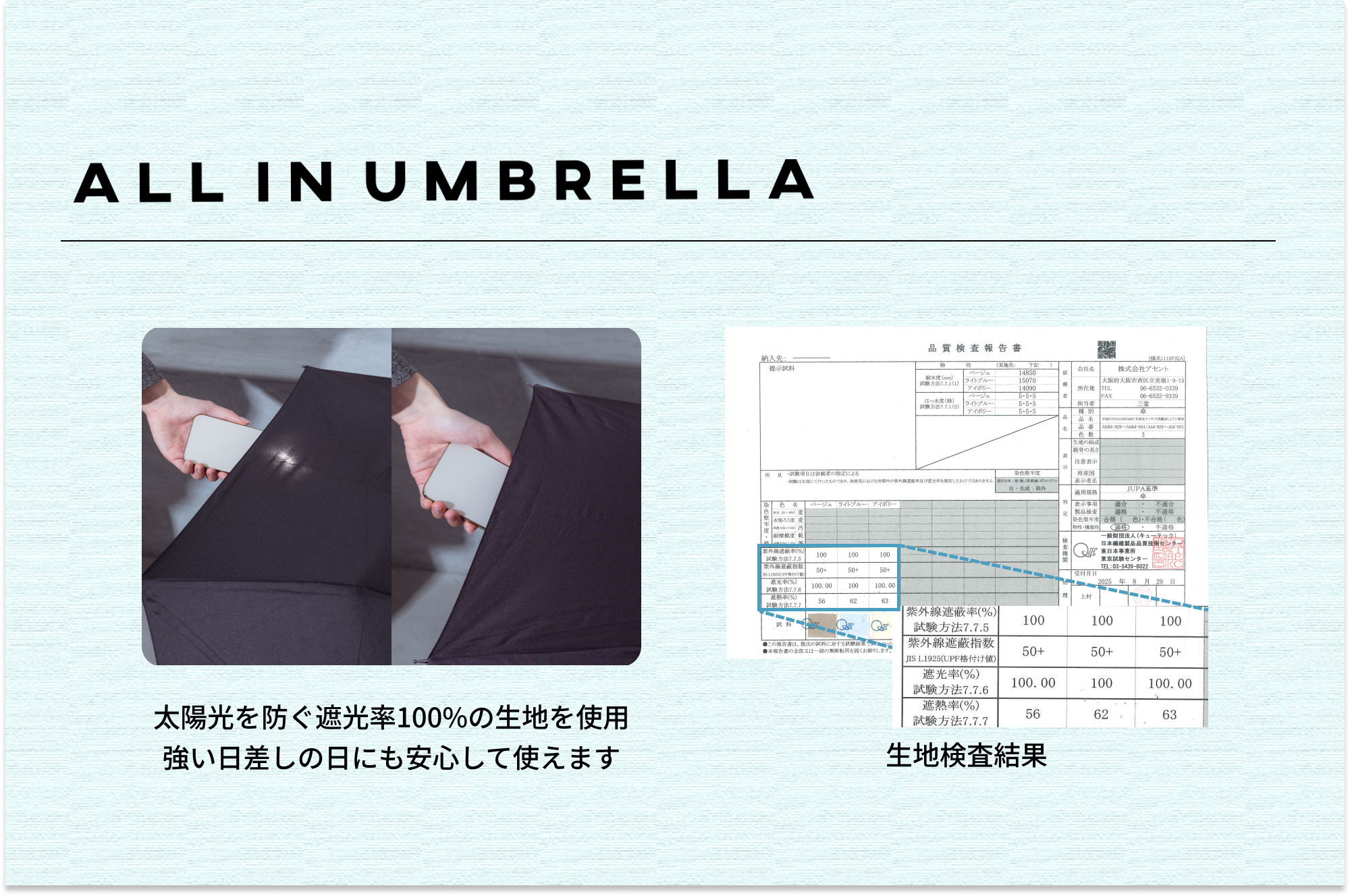 (※)当製品はJIS L 1055A法(遮光率)とJIS L 1925(紫外線遮蔽率)に基づく検査で、ともに100%が確認されましたが、結果の数値は生地の状態での測定値であり傘本体の性能を示す数値ではございません。また、商品生産時期により付属品等への記載が「99%」等の表記の場合がございます。その場合でも検査上「100%」を確認した商品ですので、予めご了承くださいませ。