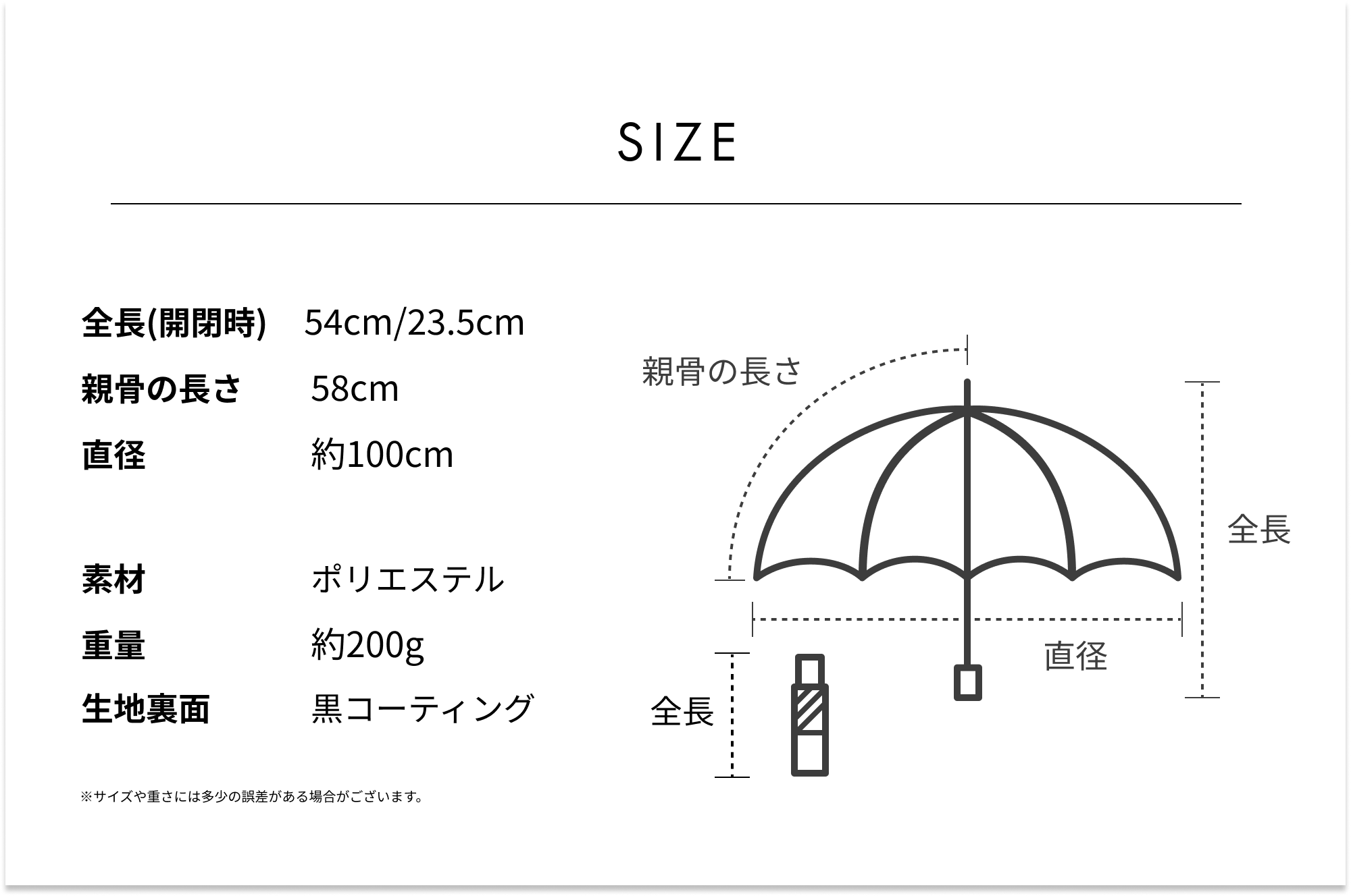 通常の折りたたみ日傘より大きい親骨58cmサイズなので、男女問わず使えるユニセックス仕様。開くと直径約100cmの大きめサイズで、激しい雨も夏の強い日差しもしっかりカバーできます。