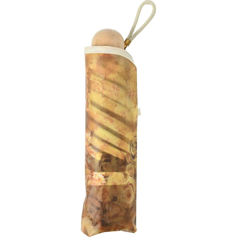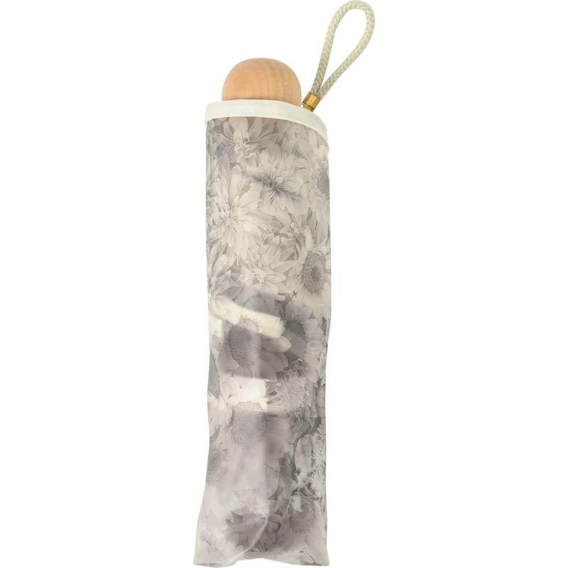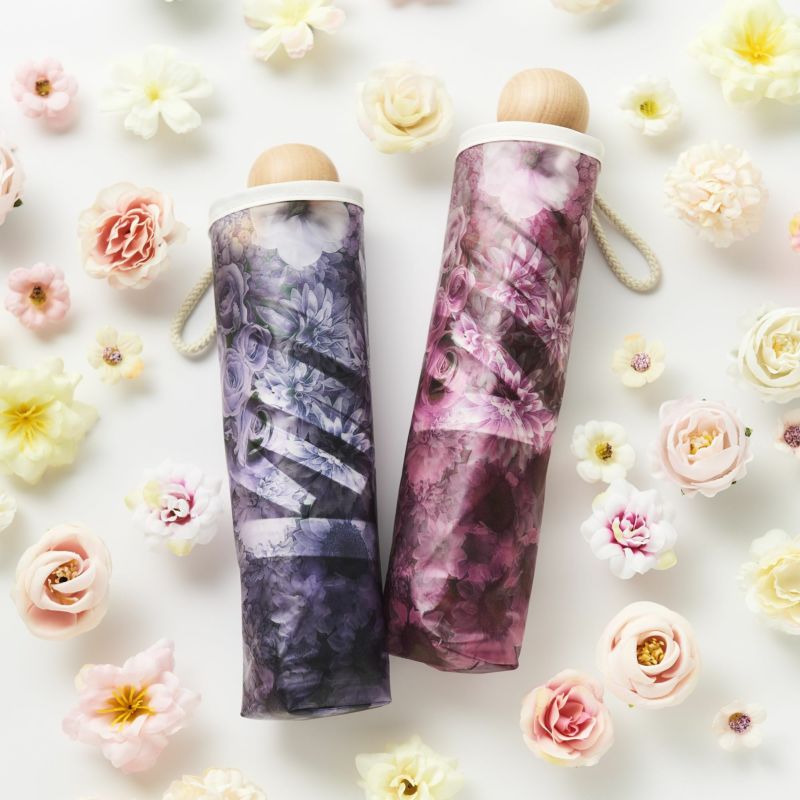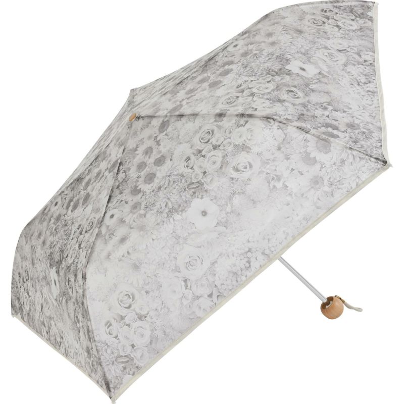 淡いくすみカラーの花柄がアンティークなエレガントさを演出。手元にはころんとしたシルエットの木を使用し、ぬくもりも感じられるデザインです。