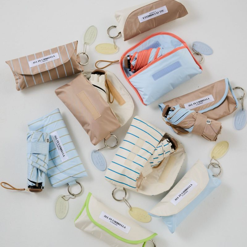 大人気のALL IN UMBRELLA シリーズから新ラインが登場!傘生地でつくられたポーチはバッグチャームとして吊り下げられるカラビナ付き。ポーチ内側には吸水生地を使用しているから雨で濡れた傘をかばんにしまう必要もなく、毎日をスマートに彩ってくれるアイテムです。