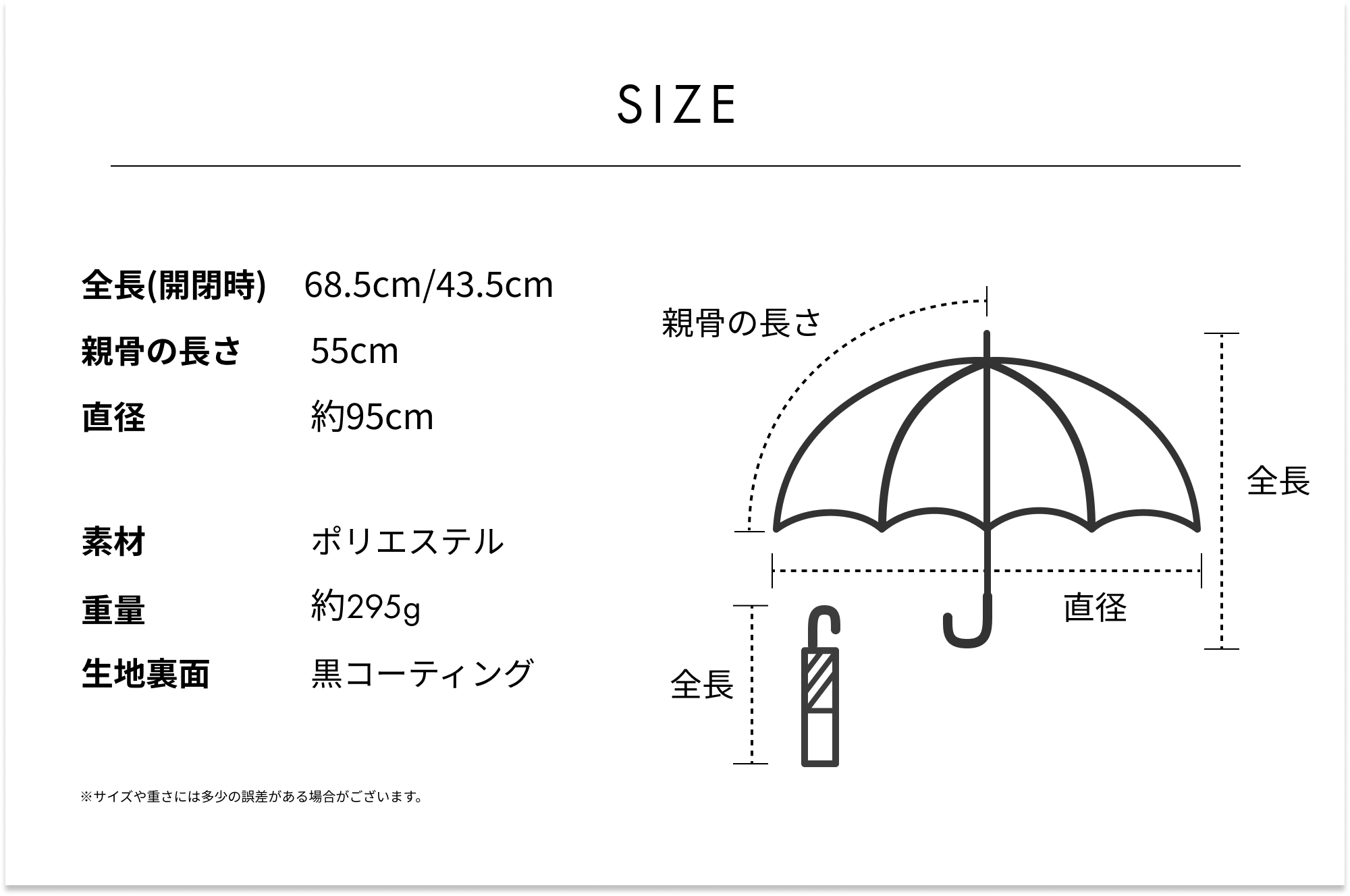 親骨は通常の日傘より大きい親骨55cm(通常のレディース日傘:親骨50cm)。深張りなので大きくて丸いシルエット。日差しや雨から体を包み込むように守ります。