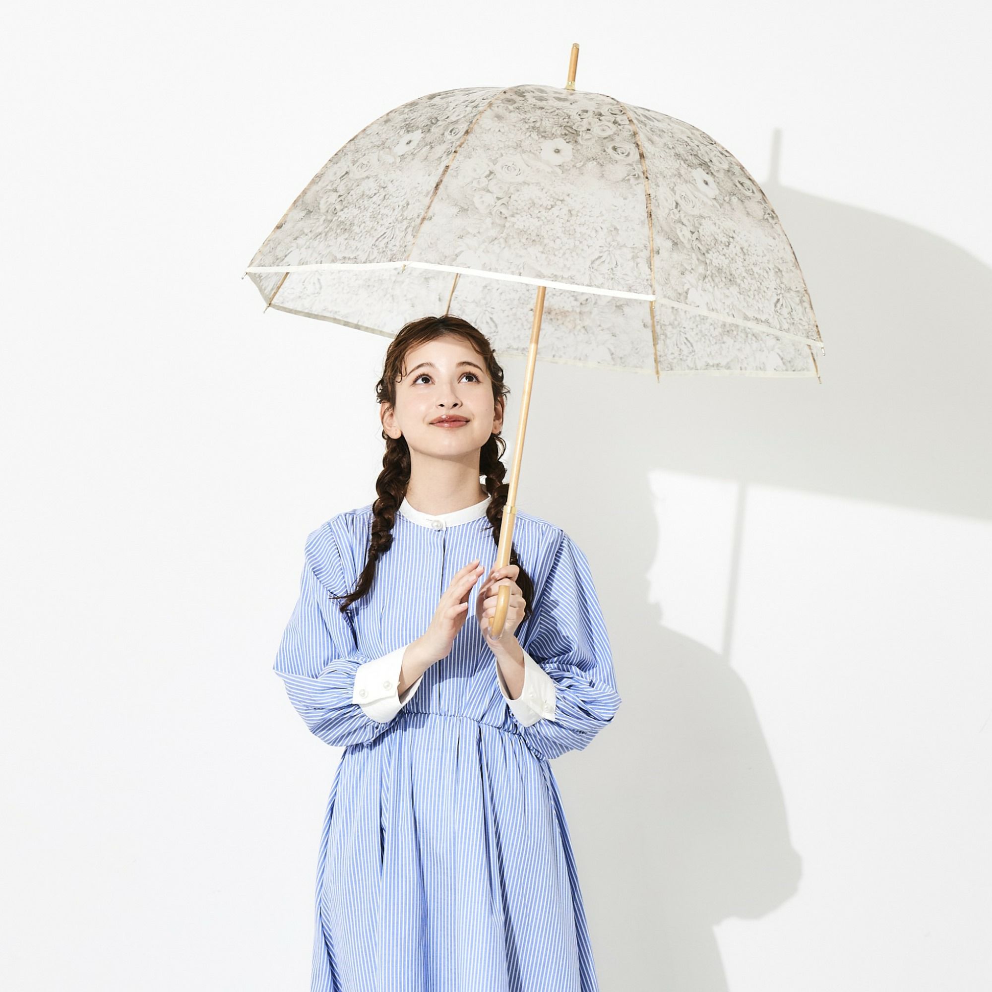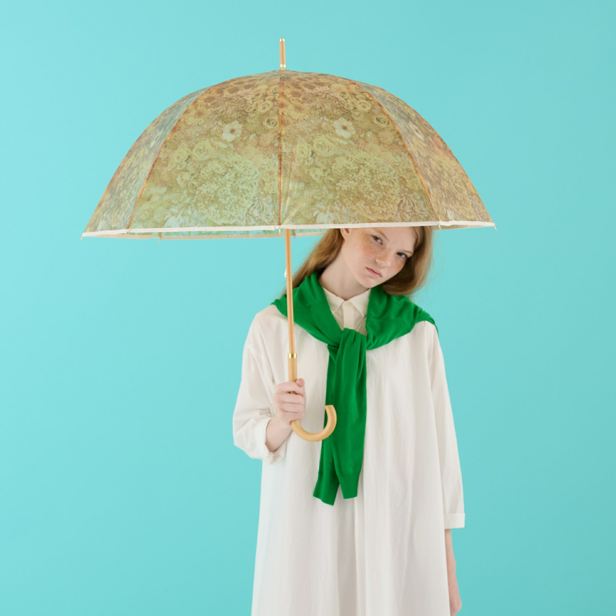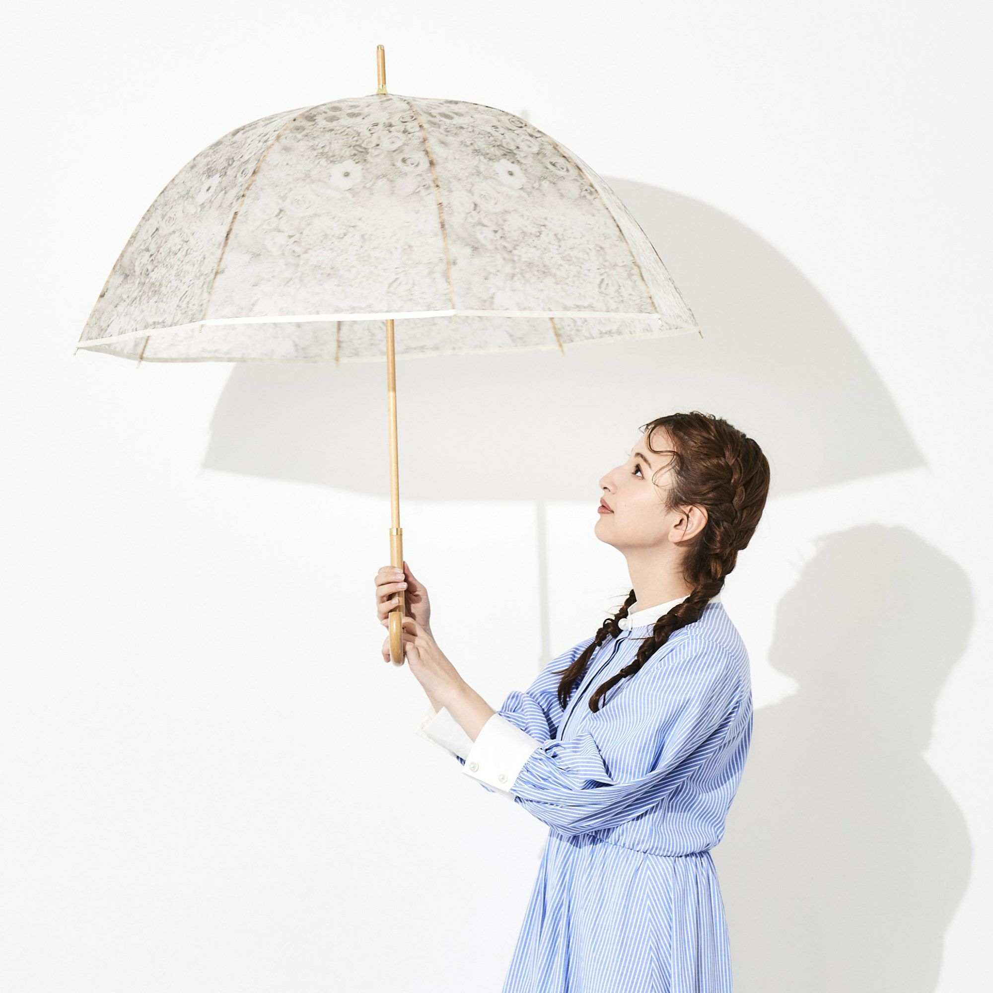 淡いくすみカラーの花柄がアンティークなエレガントさを演出。手元や中棒には木を使用し、ぬくもりも感じられるデザインです。