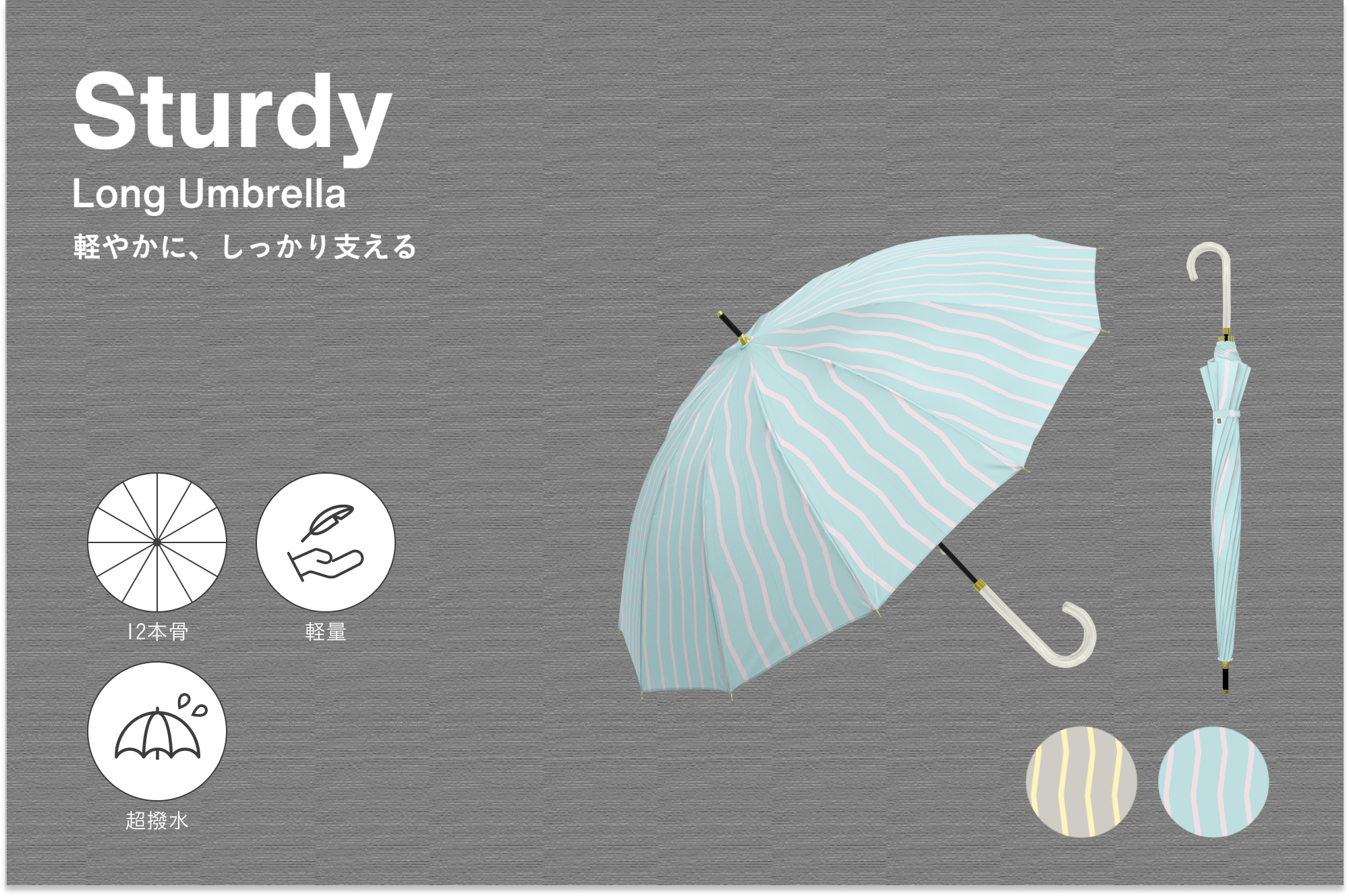 通常より多めの12本のグラスファイバー骨を使用。軽い持ち心地ながら、風に強い丈夫な構造でしっかりと体を守ってくれます。