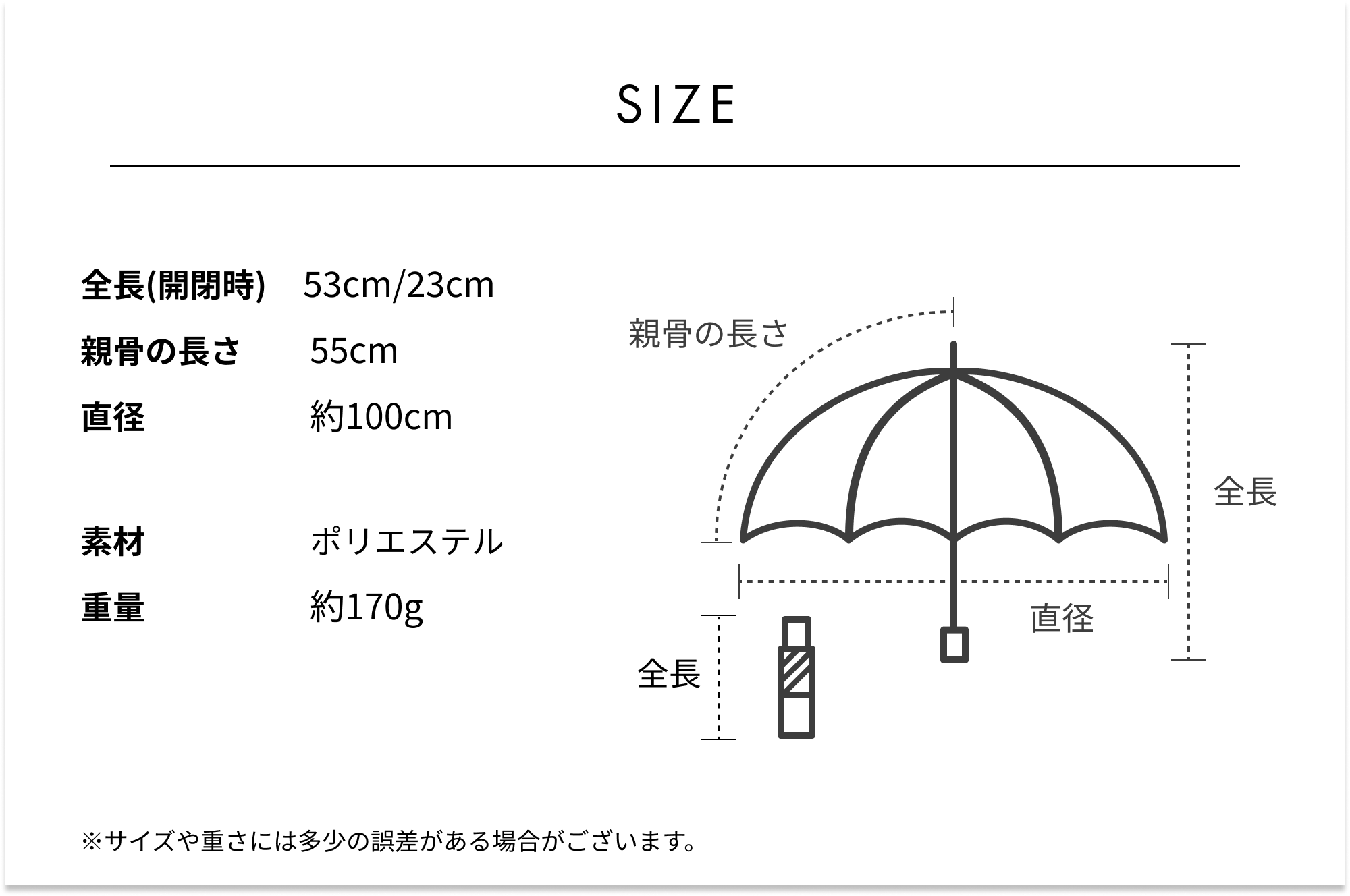 親骨55cmサイズの大きめ仕様(通常の折りたたみ傘:親骨50cm)。なのに、たたむとスリムなシルエットに。カバンに入れておくと安心の1本です。